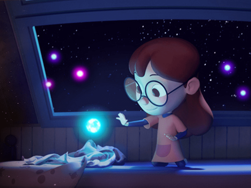 Scéance de planétarium : Celeste, une fillette de huit ans, lutte contre le sommeil dans sa chambre pleine de livres et maquettes scientifiques, jusqu’à ce qu’elle reçoive la visite imprévue de Moon, une petite « étincelle » venue d’une étoile lointaine.