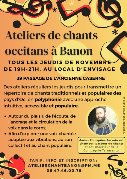 Les ateliers de chants occitans en polyphonie restent ouverts et auront lieu tous les jeudis du mois de novembre, 19h à 21h, au local d’Envisage (39 passage de l’ancienne caserne).