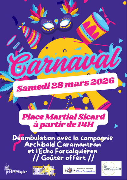 Déambulation avec la compagnie « Archibald Caramantran » et « L’écho Forcalquiéren », suivi de la mise à feu du caramantran créé par les enfants de la Cordelière. Goûter offert.