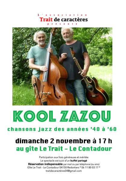 Trait de Caractère présente KOOL ZAZOU chansons jazz des années 1940 à 1960. Réservation indispensable.