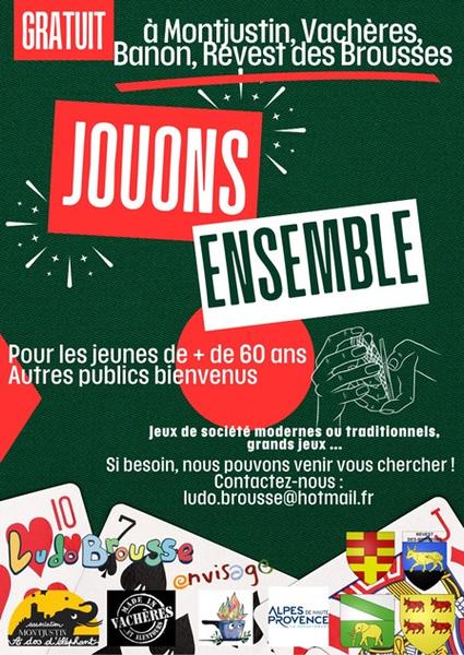C’est une action pour jouer et faire jouer les jeunes de + de 60 ans en itinérance sur la Haute Provence. Nous vous proposons de nous retrouver avec nos partenaires sur différents villages pour jouer à des jeux très connus comme le scrabble, la belote, le tarot, mais aussi à une grande variété de jeux plus récents (avec des jeux d’ambiance, stratégie, adresse, coopération, communication) qui créent l’interaction entre les joueurs.