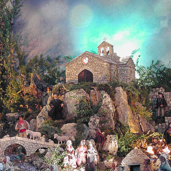 Crèche en pierres sèches et souches de bois. Le 24 décembre messe à 22h30.
