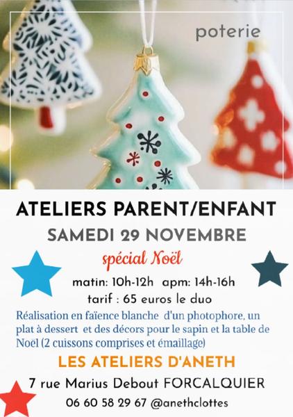 Atelier de poterie parent/enfant « spécial Noël ». De 10h à 12h et de 14h à 16h.
